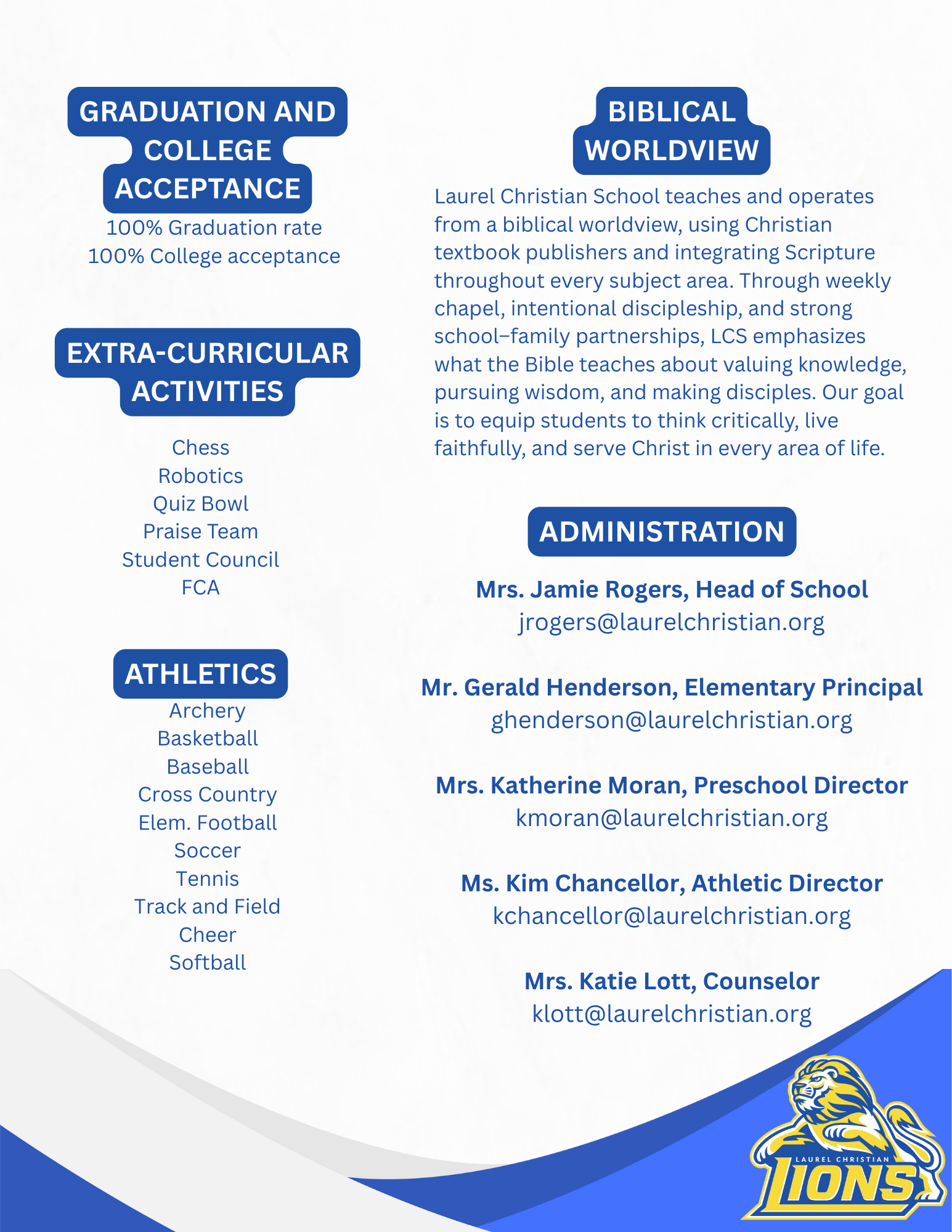 Laurel Christian School takes a spiritual approach to education. LCS is an extension of the Christian home and strives to encourage, support, and inspire students and families in a system of values consistent with the Word of God. It is our philosophy that students should have a Christ-centered view of the world, mankind and life.