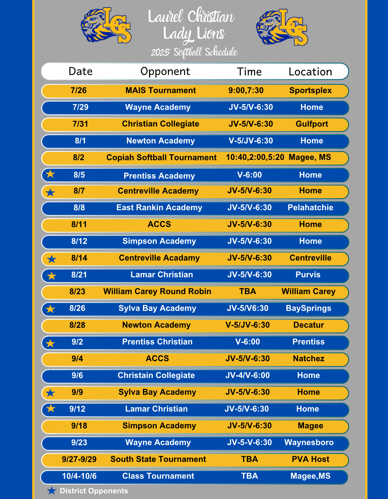 The Laurel Christian School Lady Lions softball team had an impressive showing at the MAIS 2A South State Tournament, held Saturday, September 27 and Monday, September 29 in Monroe, Louisiana. The team battled hard and finished as the South State Runner-Up, securing their place in the State Tournament on October 4–6 in Magee.