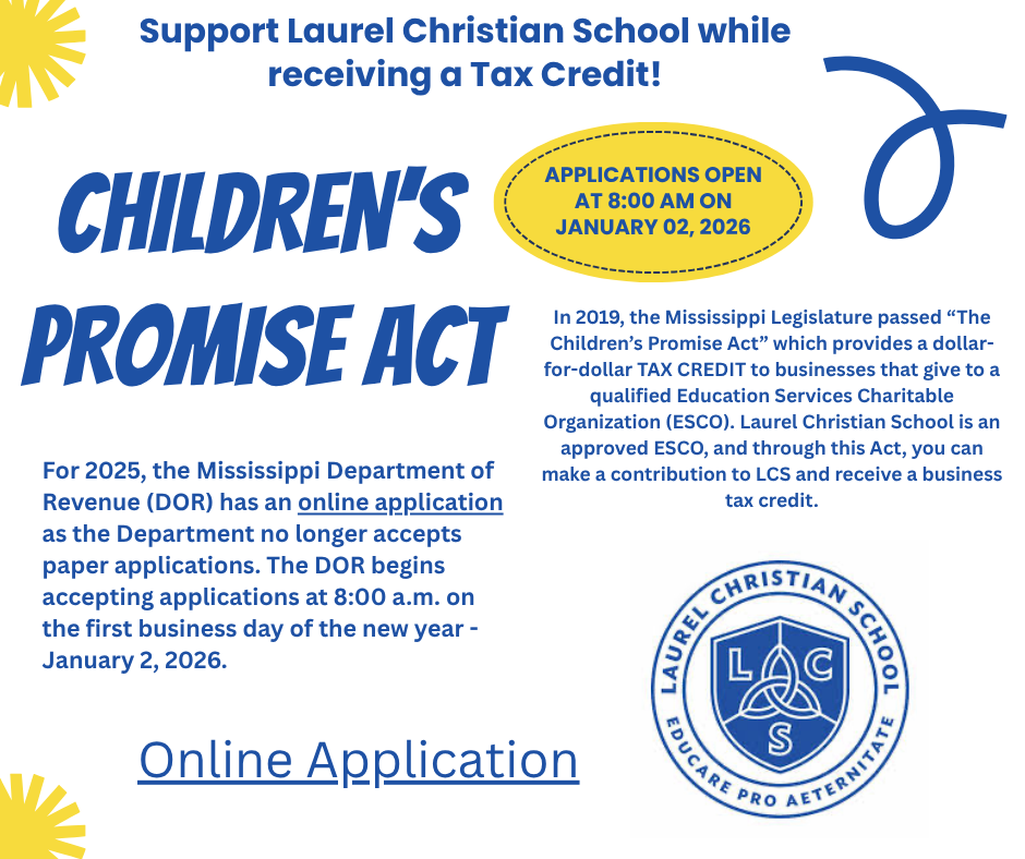 In 2019, the Mississippi Legislature passed “The Children’s Promise Act” which provides a dollar-for-dollar TAX CREDIT to businesses that give to a qualified Education Services Charitable Organization (ESCO). Laurel Christian School is an approved ESCO, and through this Act, you can make a contribution to Laurel Christian School and receive a business tax credit.